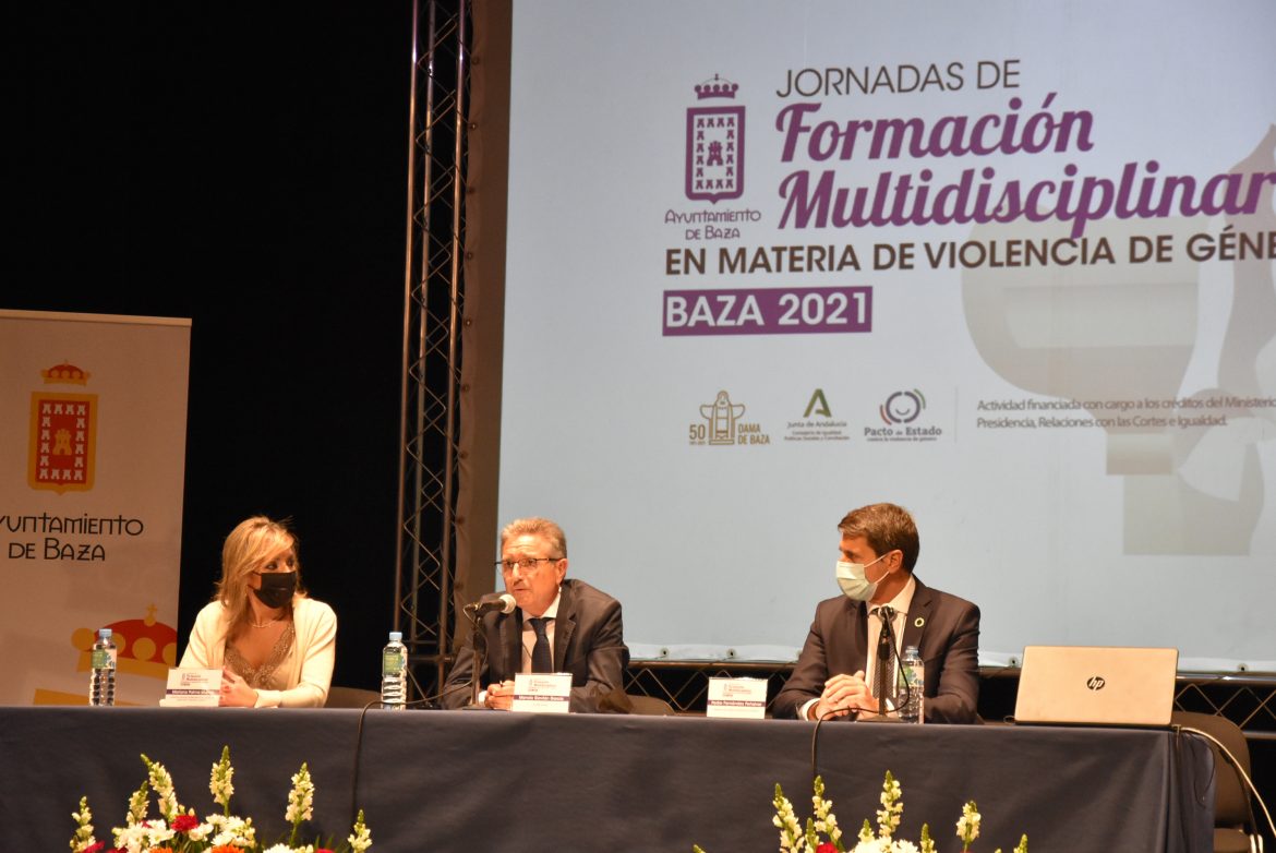 El alcalde de Baza, Manolo Gavilán, y el delegado del Gobierno en Andalucía, Pedro Fernández, han sido los encargados de inaugurar la primera sesión del programa de formación y sensibilización social en materia de violencia de género que el Ayuntamiento de Baza ha organizado con un enfoque multidisciplinar desde el área de Igualdad, Bienestar Social y Mujer que preside Mariana Palma. Profesionales del ámbito jurídico, policial, psicológico, social y sanitario se han dado cita en esta primera jornada de un programa que constará de diferentes sesiones y que se prolongará hasta marzo de 2022.