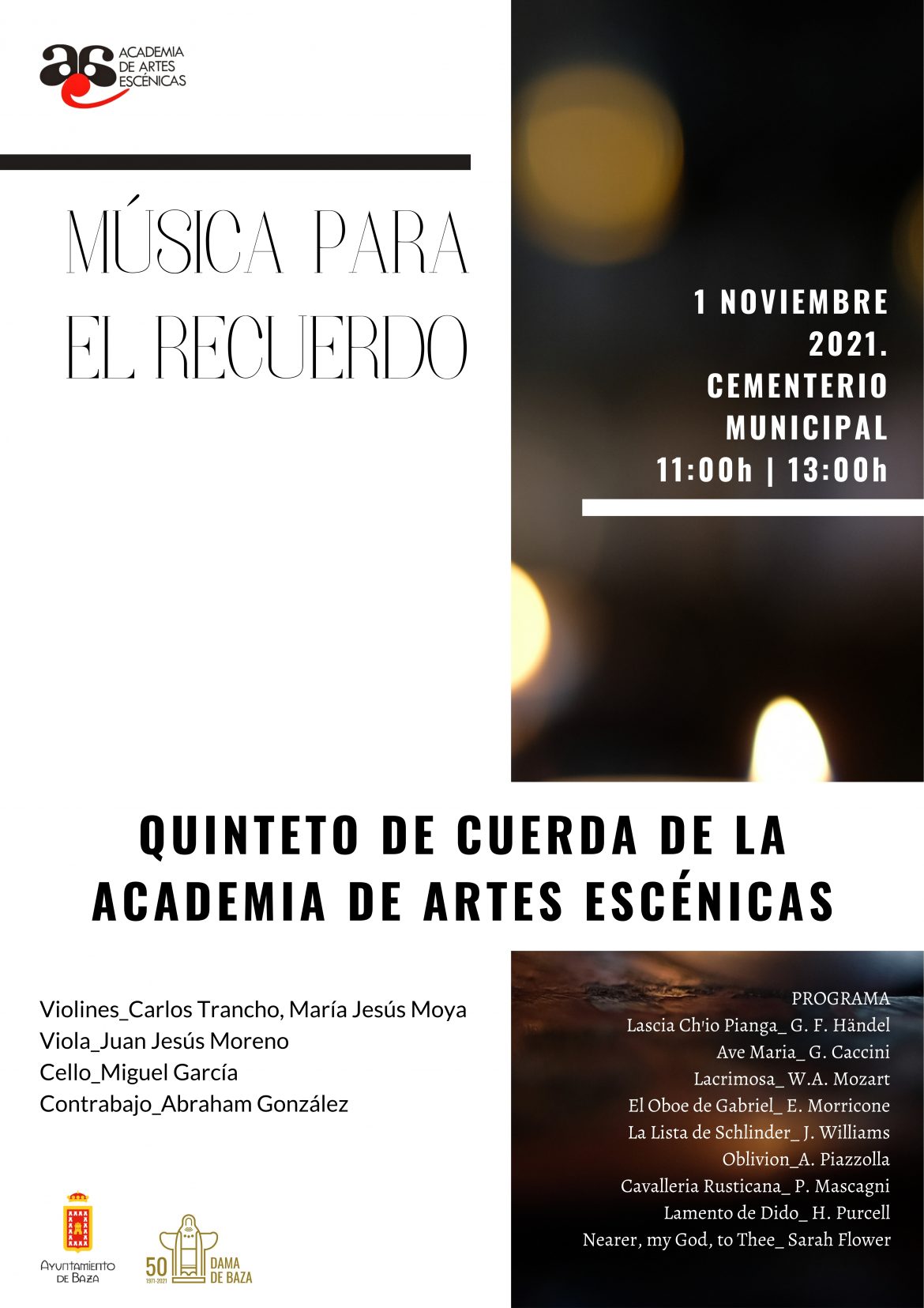 El Ayuntamiento de Baza ha programado una nueva edición de la iniciativa “Música para el recuerdo” a fin de acompañar musicalmente a los visitantes del cementerio municipal el próximo 1 de noviembre con motivo de la Festividad de Todos los Santos. En esta ocasión será el Quinteto de Cuerda de la Academia de Artes Escénicas la que interpretará un repertorio de música clásica entre las 11h y las 13h con el que se homenajeará y recordará a los familiares y personas queridas que han fallecido.