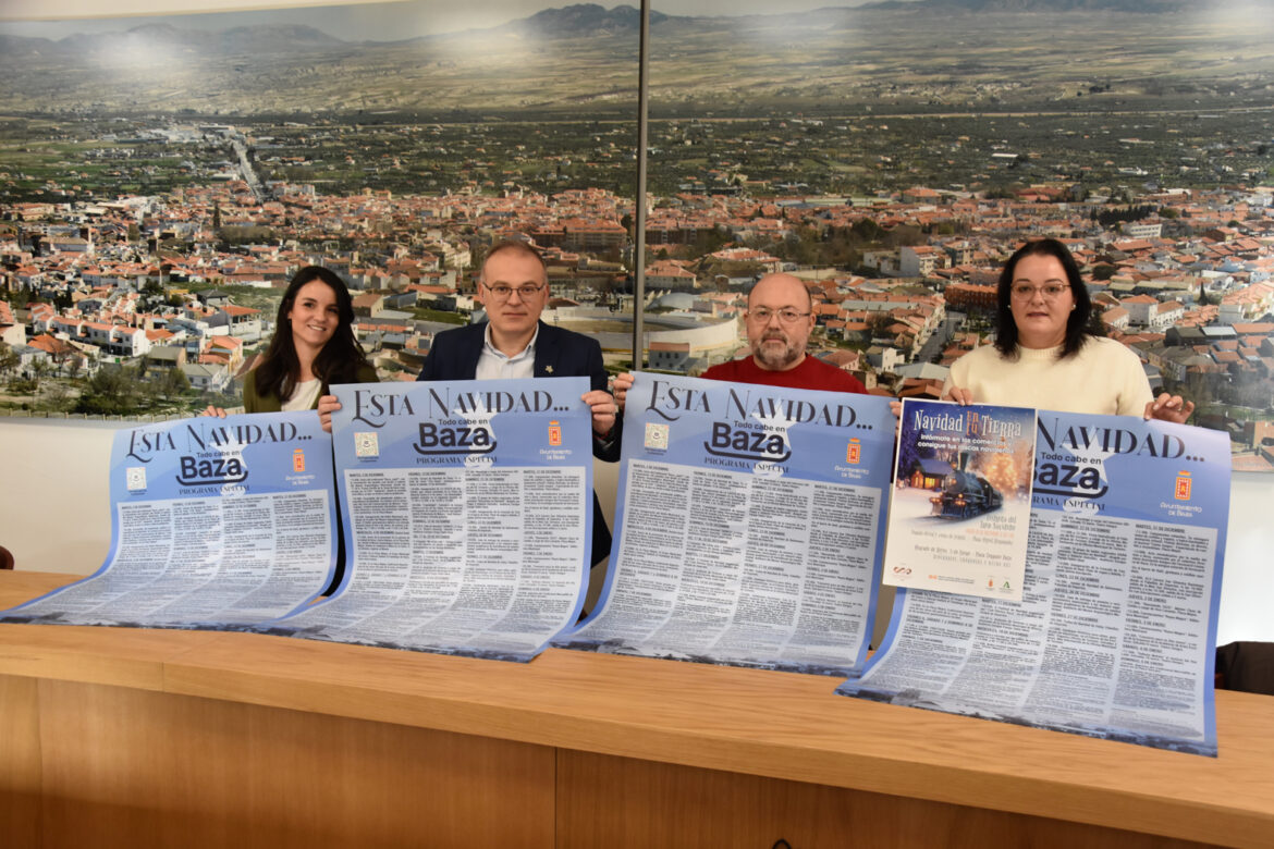 Desde el día 3 de diciembre y hasta el 8 de enero la ciudad de Baza se viste de fiesta para recibir y celebrar la Navidad y el Año Nuevo por todo lo alto. Junto a la decoración extraordinaria que ya se puede comprobar en las calles, plazas y rotondas, principalmente, la concejalía de Cultura ha coordinado una extensa e intensa programación de actividades en la que han colaborado estrechamente otras unidades como Juventud, Deportes y Bienestar Social. El objetivo es que todas las edades y sensibilidades encuentren su momento para disfrutar con un espectáculo o un reclamo cultural o deportivo en estos días tan destacados. “Hemos preparado más de 75 actividades para intentar llegar a todos y que todos encuentren en Baza un buen motivo para disfrutar de nuestra ciudad y de sus gentes”, ha indicado el alcalde, Pedro J. Ramos, que ha compartido la presentación de la campaña con varios miembros de su equipo de gobierno y con la presidenta de la Asociación de Comercio del municipio, Mª José Valverde. El concejal de Turismo y Cultura, José Gabriel López, ha sido el encargado de desgranar la enorme programación navideña de este año ante los medios de comunicación, a los que ha anunciado que esa programación se puede consultar también en la web municipal y en los folletos que se han confeccionado y que estarán disponibles en las dependencias municipales.