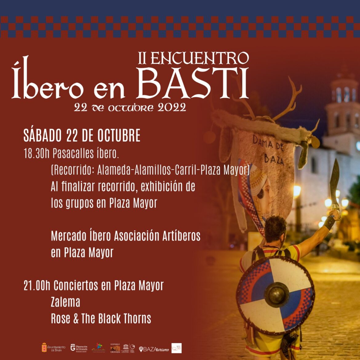El Ayuntamiento de Baza ha organizado, con el apoyo de la Diputación de Granada y de la Asociación Íbera por la Dama de Baza, el II Encuentro Íbero en Basti que se celebrará el fin de semana del 22 de octubre y en el que participarán grupos íberos de procedencias diversas. La ciudadanía y visitantes podrán disfrutar el sábado 22 de octubre a partir de las seis y media de la tarde de un pasacalles íbero con todos los participantes que recorrerá Alameda, Alamillos, Carril y Plaza Mayor. El pasacalles finalizará en ese lugar, la Plaza Mayor, con una exhibición de los grupos. También en la Plaza Mayor se instalará el Mercado Íbero de la Asociación Artíberos. La jornada se cerrará con los conciertos gratuitos de Zalema y de Rose & The Black Thorns a partir de las 21h en la Plaza Mayor.