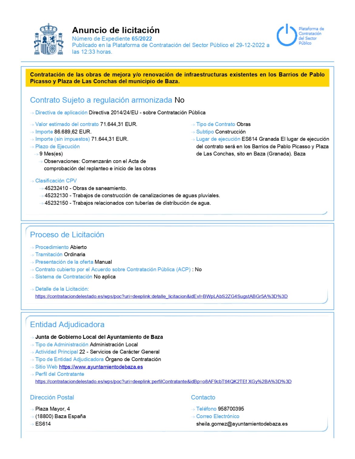 El Ayuntamiento de Baza informa que se han publicado en la Plataforma de Contratación del Sector Público los pliegos y condiciones que rigen el procedimiento de licitación para la contratación de las obras de mejora y/o renovación de infraestructuras existentes en los barrios de Pablo Picasso y Plaza de las Conchas del municipio de Baza, financiadas por la subvención para gastos extraordinarios de inversión para municipios y entidades locales autónomas menores de 50.000 habitantes correspondiente al ejercicio 2022; mediante procedimiento abierto. Las ofertas se podrán presentar hasta las 15h del 24 de enero en el Registro General de entrada de este Ayuntamiento. En el siguiente enlace se pueden descargar los pliegos y condiciones que rigen esta licitación: