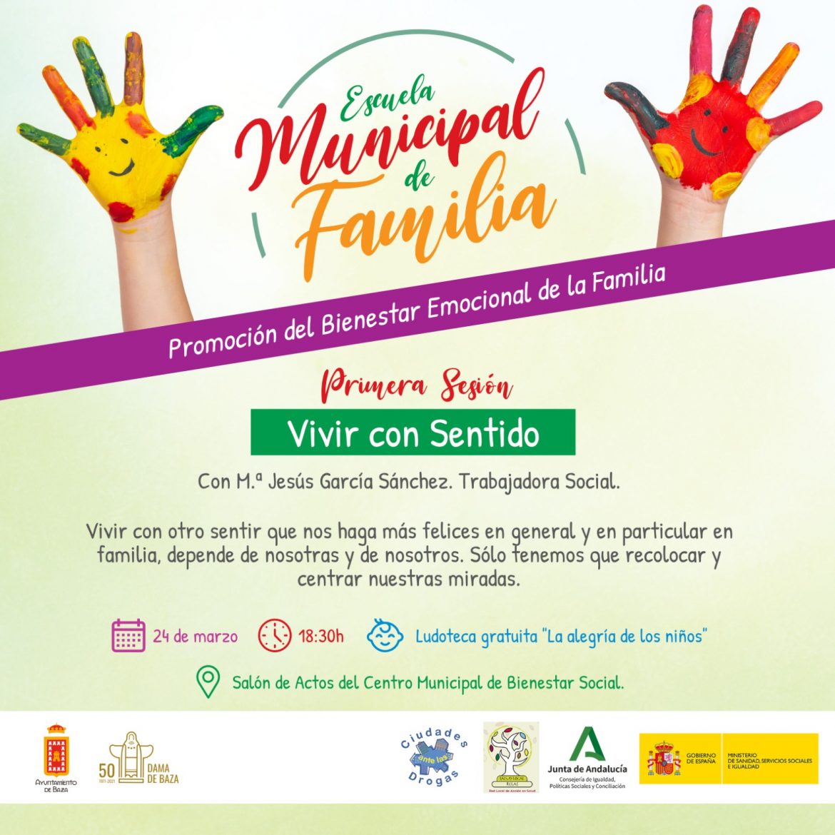 La Escuela Municipal de Familia que organiza el Ayuntamiento de Baza a través del área de Bienestar Social, Igualdad, Mujer, Salud, Deporte y Juventud arranca su programación de primavera este jueves 24 de marzo con una sesión titulada “Vivir con sentido” que impartirá María Jesús García Sánchez, trabajadora social. La cita es a las seis y media de la tarde en el salón de actos del Centro Municipal de Bienestar Social y, para facilitar la asistencia, se contará con servicio de ludoteca gratuita de la mano de “La alegría de los niños”.