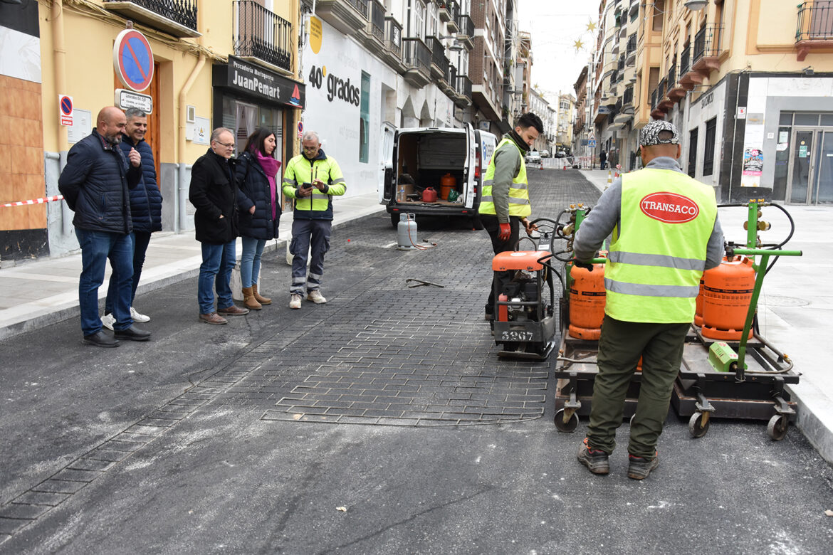En las primeras horas del viernes los operarios que trabajan en la calle ultimaban el original aspecto que va a ofrecer el asfalto de la nueva Alamillos, que simula el tradicional adoquinado pero evitando los inconvenientes y dificultades que este tipo de solería suele acarrear. El alcalde y los concejales de Urbanismo y Comercio visitaban las obras para confirmar la apertura de la vía para recibir la Navidad con comodidad para todos.