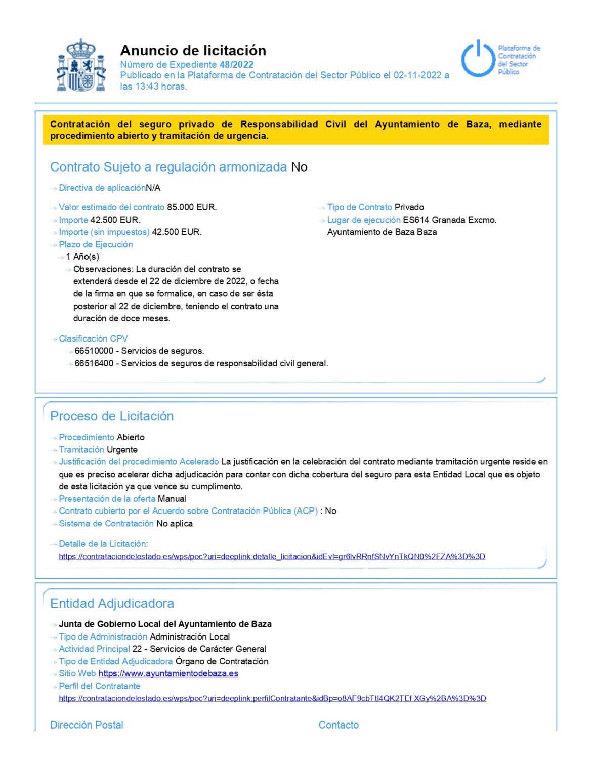 El Ayuntamiento de Baza informa que se han publicado en la Plataforma de Contratación del Sector Público los pliegos y condiciones que rigen el procedimiento de licitación para la contratación del seguro privado de responsabilidad civil del Ayuntamiento, mediante procedimiento abierto y tramitación de urgencia. Las ofertas se podrán presentar hasta el 17 de noviembre de 2022 en el Registro General de entrada de este Ayuntamiento. En el siguiente enlace se pueden descargar los pliegos y condiciones que rigen esta licitación: